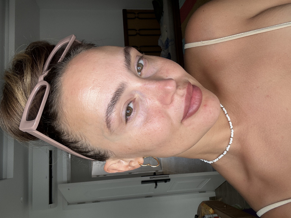 A female individual, appearing to be in her 20s or 30s, is depicted in a close-up selfie within an indoor setting in the city of Phú Quốc, Vietnam. Her brown hair is secured in a bun, with light pink framed sunglasses resting on top of her head. She wears a gold-colored heart-shaped hoop earring in her left ear and a white beaded choker necklace with intermittent silver beads. A light-colored strap from her garment is visible over her right shoulder. Her face is directed towards the camera, exhibiting a slight smile. The background features a light-colored wall. To the left, a white door is partially open, displaying a dark handle, with a white wall-mounted air conditioning unit visible above it. To the right, a dark wooden headboard and a portion of a bed with a striped blanket are discernible.