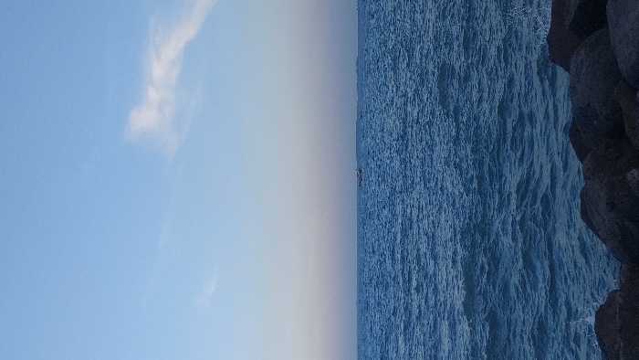 The image displays a coastal scene from an unspecified location in the city of Unknown, Unknown. The view is dominated by a vast body of water, likely a sea or ocean, under a predominantly clear, light blue sky. The sky occupies the upper portion of the frame, showing a subtle gradient from a lighter blue at the horizon to a slightly deeper blue overhead, with one distinct wispy white cloud visible in the upper right quadrant. The middle section of the image features the deep blue water, characterized by numerous small, agitated waves and ripples across its surface. A distinct horizon line separates the water from the sky. In the far distance on the water, slightly to the right of the central axis, a small, light-colored boat with a dark upper structure is visible, appearing to move towards the right. Along the distant horizon, faint, dark linear forms suggest the presence of landmasses or other distant vessels. The foreground, occupying the bottom portion of the image, consists of large, dark, irregular-shaped rocks, forming a natural or artificial barrier. White foamy splashes are visible against these rocks on the right side, indicating waves breaking upon the shore. No identifiable people are present in the scene.