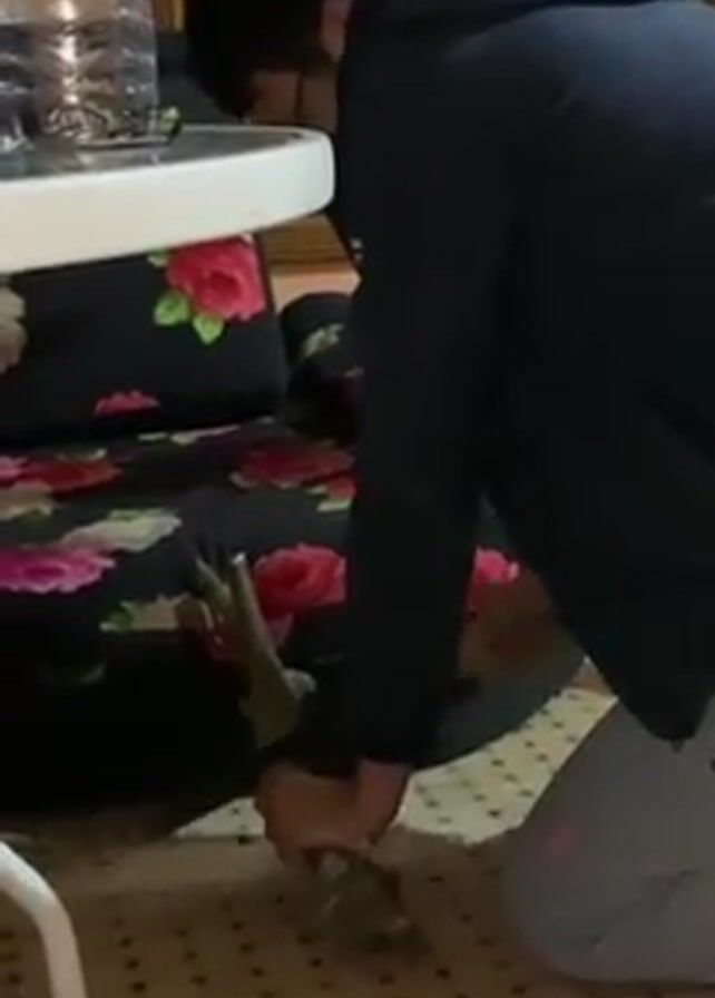 A person in a dark jacket and grey pants is kneeling on a carpet, bending over to groom a dog with grey fur. The dog is sitting on a dark floral patterned cushion. To the left is a small white round table with a water bottle on it. The carpet has a patterned design. The person is using a grooming tool in their hands to brush the dog.