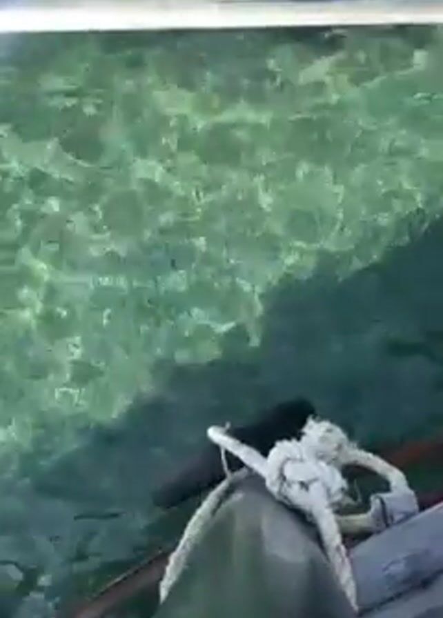 The camera looks down from a dock into clear, shallow water. A dark mooring fender is visible on the edge of the dock with a white rope attached to it. The water is filled with many small fish swimming in different directions. The water is translucent and casts reflections on the surface, making the bottom only partially visible.