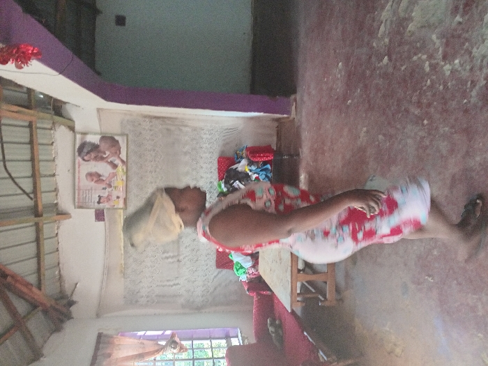 A woman in a floral dress stands in a room. A framed image of a mother and child hangs on the wall. Clothes are piled near a wooden table. The room features a window with a view to the outside, a roof structure, and walls with worn or distressed texture. The floor has a reddish tone with variations in color.