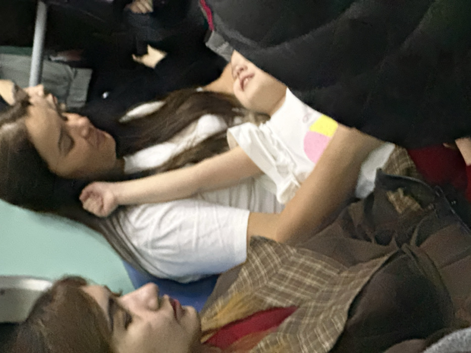 The image depicts a crowded interior space, identified as a public transport vehicle, likely a metro car, within the city of Tashkent, Uzbekistan. Three primary subjects are visible in the foreground, seated. On the left, an adult female with light brown hair, visible in profile, wears a red top under a brown and beige plaid overshirt. Her gaze is directed downwards. Centrally positioned is an adult female with long dark hair, wearing a white short-sleeved t-shirt. Her right arm is bent with a closed fist near her chest. She holds a young female child in her lap. The child, approximately a toddler, lies on her back across the lap of the central adult female, with her head tilted upwards and mouth open, suggesting a laugh or smile. She wears a white top with a circular pink and yellow graphic, and red trousers. Her arms are raised. Behind the central adult female, two other individuals are partially visible, one wearing a dark jacket, seated directly behind, and another less distinct figure further back. The immediate background consists of a light green wall paneling. A horizontal metallic handrail is visible in the upper right. Seating is partially visible in a blue tone.