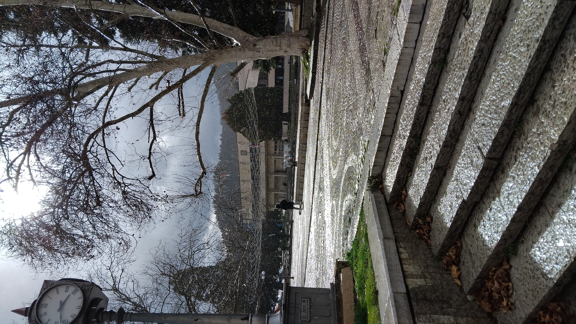The image portrays a public square in the city of Troyan, Bulgaria, during a period of light snow or sleet. The environment is characterized by a bright, partially cloudy sky and wet, reflective surfaces. In the immediate foreground, a flight of six visible stone steps ascends from left to right, exhibiting a textured, wet surface that reflects light. Patches of brown fallen leaves are present on the steps and alongside the base of a low stone wall to the left, which is topped with a small strip of green grass. To the left, a tall, dark grey metal clock tower stands. Its round clock face, featuring Roman numerals, displays a time of approximately 03:45. Below the clock face, an inscription reads "© 2011" and "РОТАРИ КЛУБ - ТРОЯН" (Rotary Club - Troyan). The midground is dominated by an expansive, wet paved area constructed from light and dark cobblestones arranged in a swirling, curvilinear pattern, reflecting the bright overhead sun. A single individual, clad in dark clothing, walks from left to right across this paved area, observed from a slight rear-left angle. Several bare deciduous trees with intricate branch networks are scattered throughout the scene, notably a large tree with light-colored bark on the right side. In the background, a light-colored, multi-story building, likely a municipal structure, is visible, with multiple windows and poles bearing flags positioned in front of it. Dark, tree-covered hills or mountains rise in the far background beneath the bright sun, which is partially obscured by clouds and tree branches in the upper left quadrant of the frame.