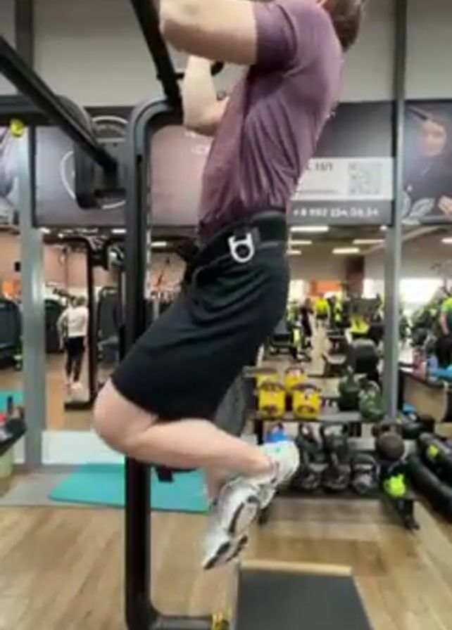 In a well-lit gym, a man with light brown hair and a light complexion is performing pull-ups. He wears a maroon t-shirt, black shorts, and white sneakers with blue accents. A weight belt is secured around his waist. His feet are placed on a low black platform that sits on the gym floor. He is holding onto a black bar, pulling himself up in a controlled motion. The camera remains static, focused on the man and his exercise. In the background, various gym equipment, including weights, treadmills, and other machines, are visible. People can be seen exercising in the distance, and there's a sign on the wall behind the pull-up machine that includes a phone number. The gym's floor is a light wooden color.