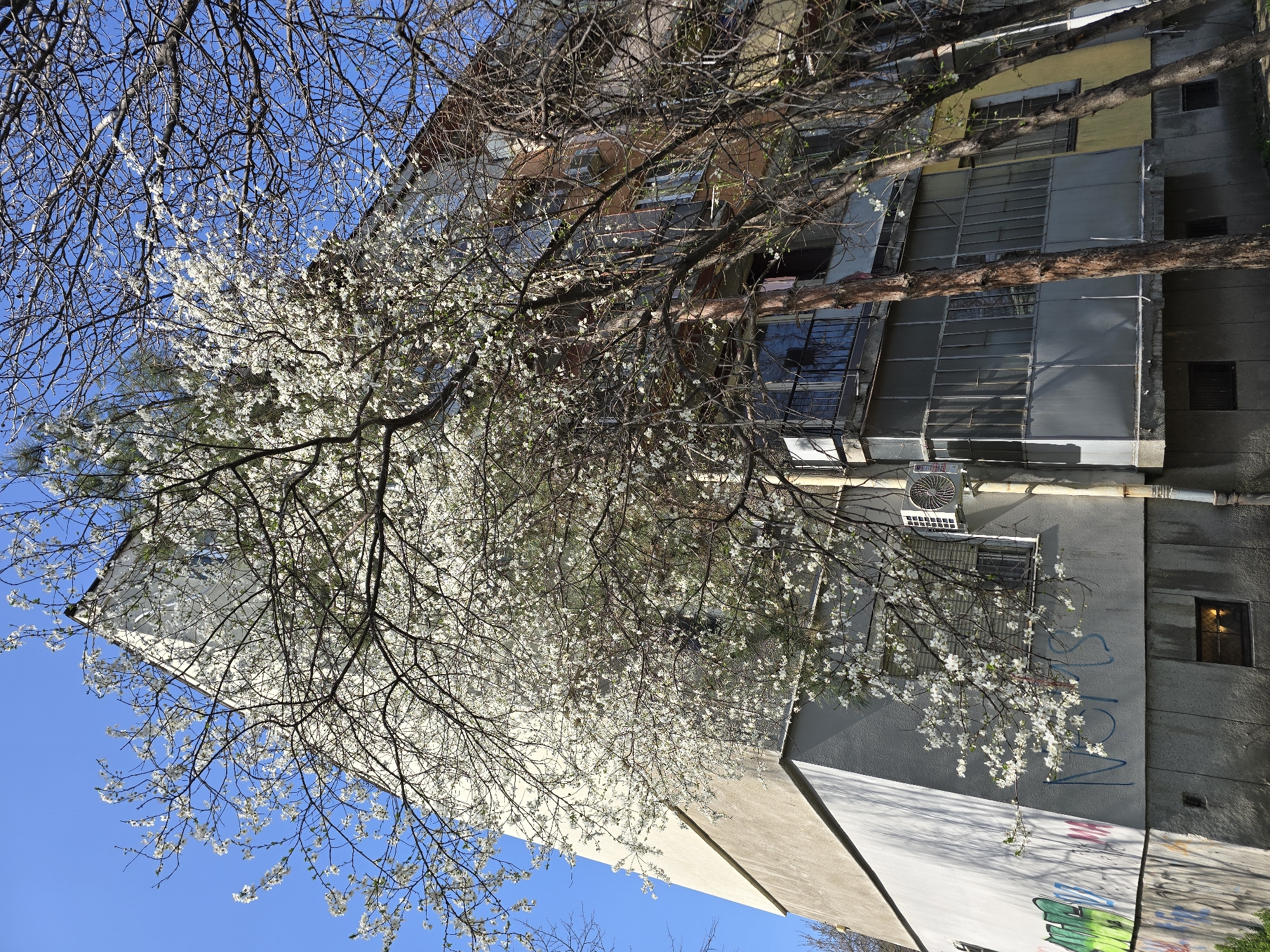 The image captures a multi-story residential building in Plovdiv, Bulgaria, under a clear blue sky. The building exhibits varied facades: the prominent left section is light beige/off-white over a grey concrete base, while the right section features shades of yellow and reddish-brown. A large tree, dense with white blossoms, stands in the foreground, its branches extending across the central and left portions of the building. Other trees with mostly bare, dark branches are visible on the right side. The building features multiple balconies; some are open with black railings, while others are enclosed with glass panels. An outdoor air conditioning unit is mounted on the grey section of the building's left facade, below an enclosed balcony. Below this, on the concrete base, multiple layers of graffiti are present, including green and red spray paint, and distinct blue letters spelling "NEMS." Several rectangular basement windows are visible along the building's lower perimeter. The scene is brightly lit by sunlight, casting shadows on the building surfaces. No individuals are visible.