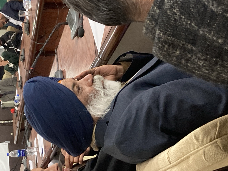 This image displays an indoor meeting or conference taking place in Quetta City Tehsil, Pakistan. In the left foreground, an elderly man with a prominent white beard and mustache is seated in a light-colored, upholstered chair. He wears a dark blue turban and a dark blue suit jacket over a brown garment. His right hand is raised, with fingers lightly touching his right temple/cheek area, and his gaze is directed slightly to the right. Behind him, a long, polished wooden conference table with a curved edge extends across the midground. Several gooseneck microphones and compact audio input devices are spaced along the table. Resting on the tabletop are clear drinking glasses, white papers, and multiple plastic water bottles, one identifiable as "Aquafina." In the background, several other individuals are seated around the table. Their faces are mostly obscured or out of focus. Attire among these individuals includes dark suits and jackets, with one person visible in a green sweatshirt featuring white lettering. The overall scene depicts a formal gathering with participants seated around a conference table equipped for discussion.