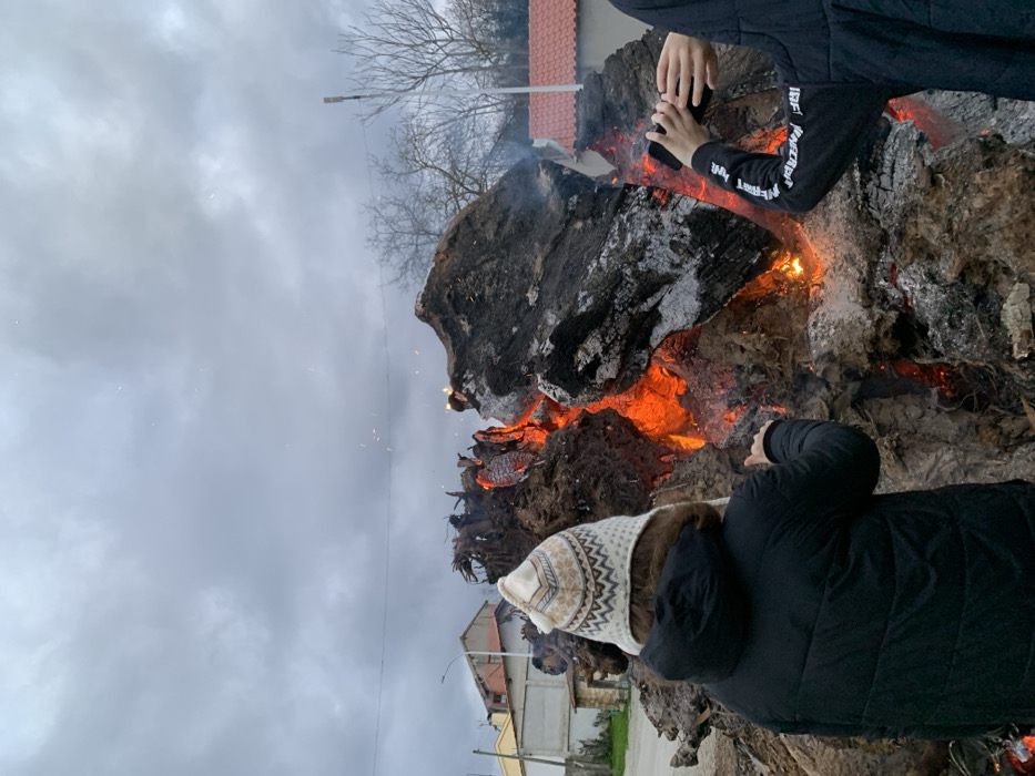 The image displays an outdoor scene in Macedo de Cavaleiros, Portugal, centered on a large, active bonfire under an overcast, light gray sky. Two individuals are positioned in the foreground, viewed from behind. The person on the left wears a dark puffer jacket and a light-colored knitted hat with a patterned band, extending their right hand towards the heat of the fire. The individual on the right, wearing a dark hooded garment with white text on the sleeve, holds a dark smartphone horizontally, pointing it at the bonfire. The bonfire itself is composed of a large accumulation of logs, roots, and charred wood, emitting vibrant orange and red flames, with glowing embers visible throughout. Sparks are seen rising from the fire against the sky. In the background to the left, residential buildings with light-colored facades and reddish-brown tiled roofs are visible, along with a utility pole and bare deciduous trees. To the right, additional bare trees and a section of a building with a reddish-orange tiled roof are present. The ground in the immediate foreground is a paved surface.