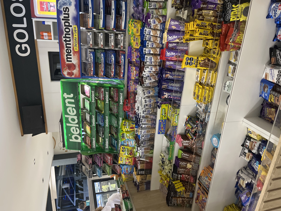 An aisle in a convenience store showcases a variety of impulse buys