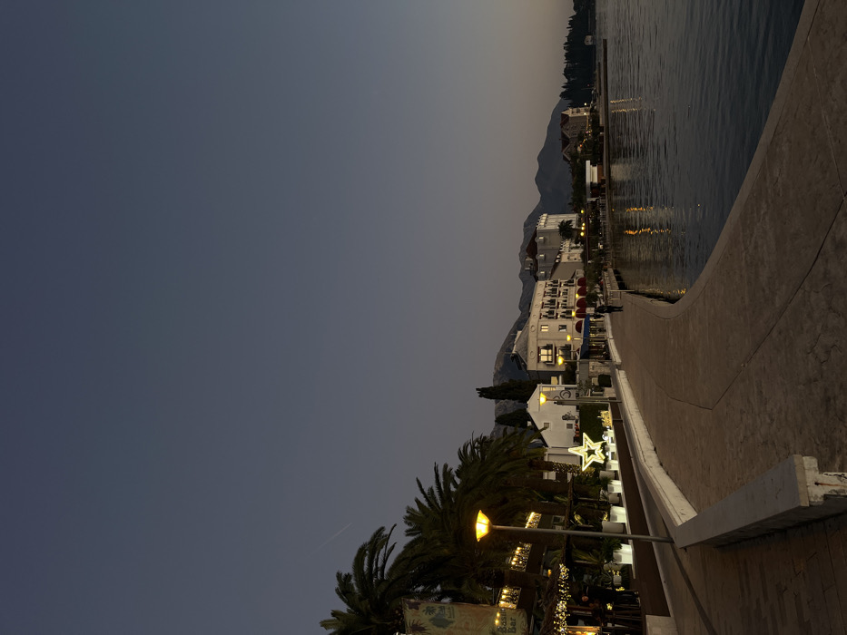 The image captures a waterfront scene in Tivat, Montenegro, at dusk or early night