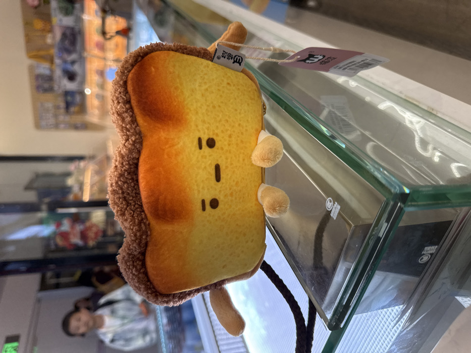 - "A plush toy, designed as a stylized slice of toast or bread, rests centrally on a clear glass display case within an indoor commercial establishment in Guangming District, China" by FM-Ribsj1, licensed under CC BY 4.0