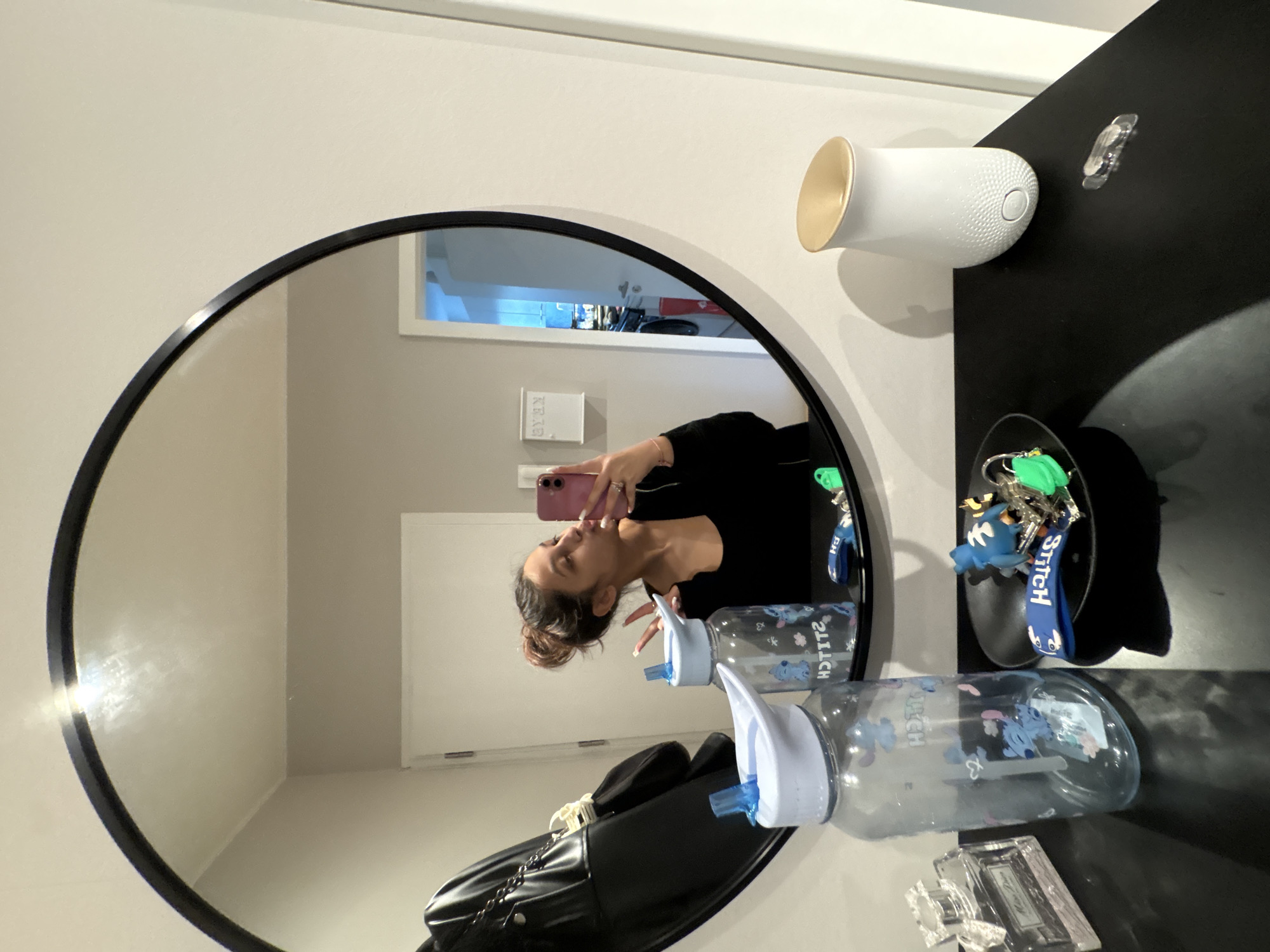 The image displays an interior residential scene located in Mönchengladbach, Germany, observed through a circular mirror with a black frame. A female individual with brown hair, styled in a bun and wearing a dark top, is reflected in the mirror, holding a pink smartphone in her left hand (viewer's right) to capture a selfie. She is posing with puckered lips and her right hand (viewer's left) raised in a "peace" sign gesture. On the black surface directly beneath the mirror, from left to right, are: a clear glass perfume bottle with an ornate stopper; a clear plastic water bottle adorned with blue "Stitch" characters, featuring a light blue flip-top straw; a small black dish containing a set of keys with a blue "Stitch" keychain and a neon green tag; and a white, conical air freshener or diffuser with a gold-colored top and a textured base. A small, clear plastic adhesive hook is also present on the surface to the right of the keys. Within the mirror's reflection, to the left of the individual, a black bag with a chain strap is hanging on a hook. Another "Stitch" branded water bottle is reflected on the black surface. Behind the individual, a white doorway leads into another room. To the right of the individual's head, a white wall-mounted key holder or shelf with the mirrored text "BYEK" is visible. Further to the right, through an open doorway, a partial view of an adjacent room, possibly a kitchen or utility area, reveals blue lighting and a red object, likely an appliance. The walls of the visible interior space are painted a light, neutral color.