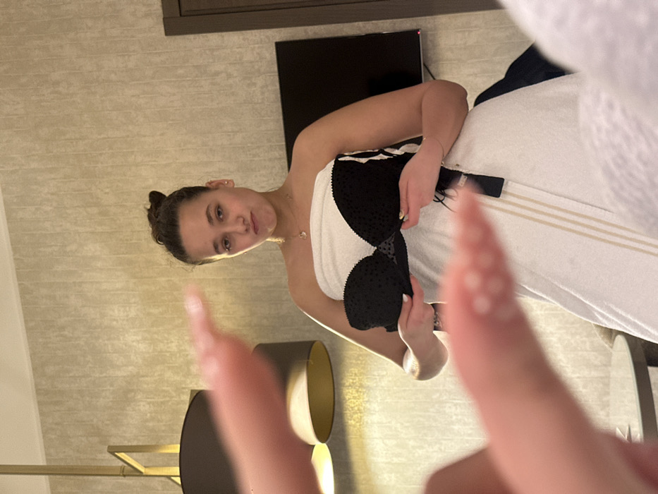 A woman with brown hair pulled back in a bun sits on a bed, draped in a white towel. She holds a black bra with polka dots. The background includes a patterned wall, a black television, and a gold-colored lamp. A hand with long, decorated fingernails partially obscures the view in the foreground.