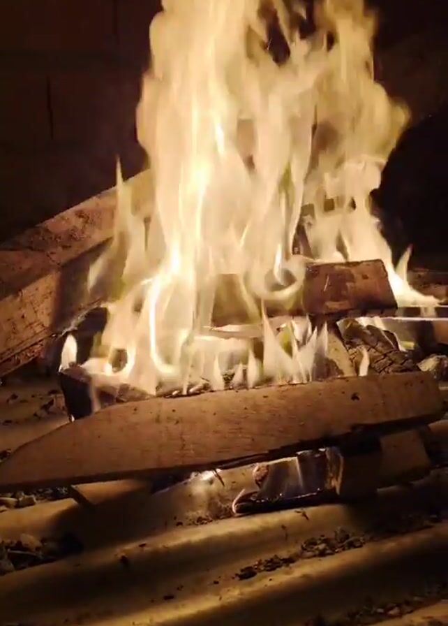 A campfire burns with tall flames on a corrugated metal surface. The fire is made of wooden planks. The background is dark with the suggestion of a brick wall. The sound of music is heard.