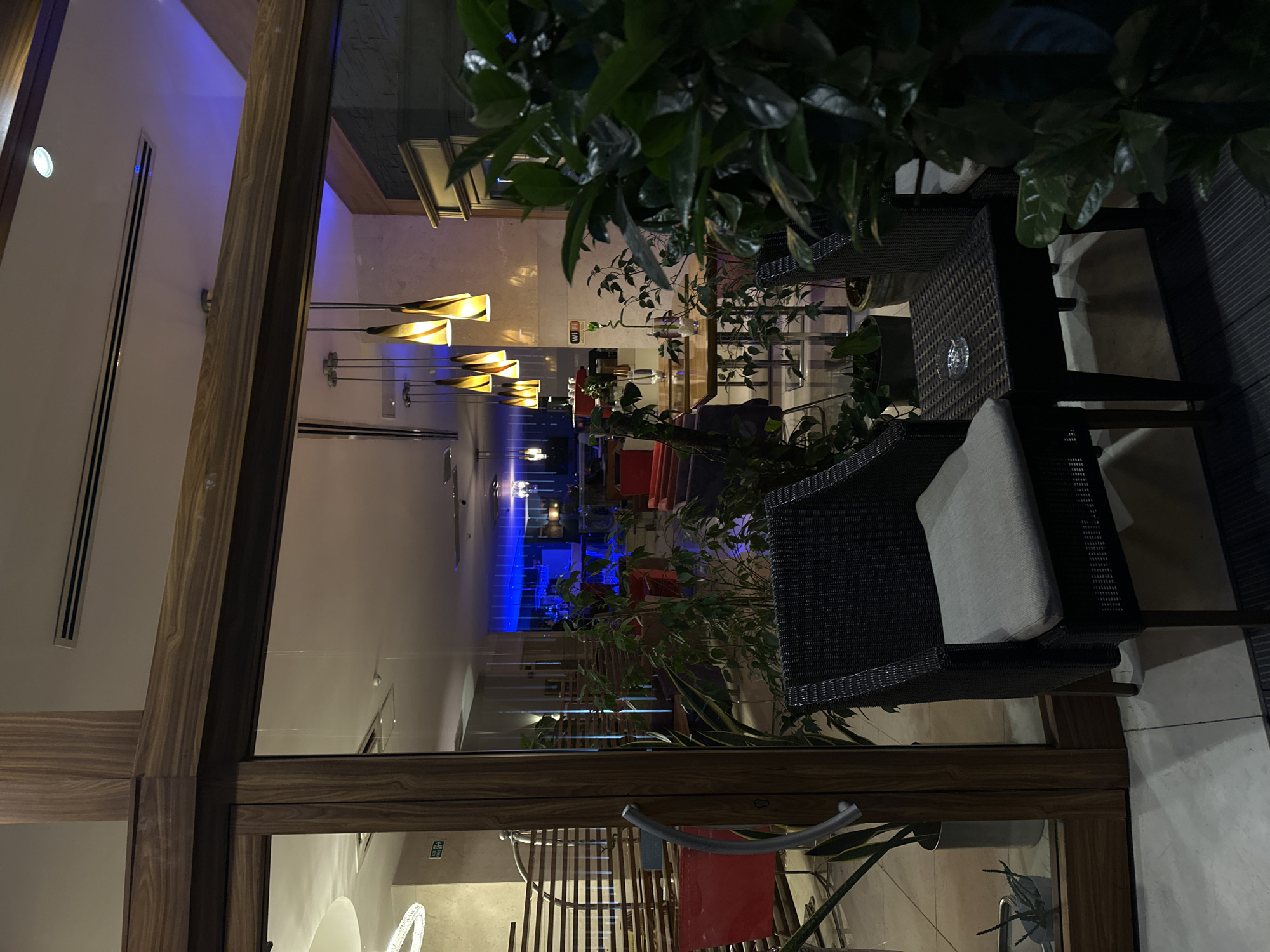 This image depicts an outdoor patio adjacent to an indoor lounge area, likely a café or restaurant, located in Beyoğlu, Turkey, at night. The foreground shows a dark wicker armchair with a light gray cushion, positioned on a tiled floor with a darker, possibly wood-decked or matted, section to its right. To the armchair's immediate right is a small, square dark wicker table, upon which a clear glass ashtray rests. Several potted plants with dense green foliage partially obscure the view from the right. A large wooden-framed glass door and window separate the outdoor patio from the indoor space. The door, on the left, features a silver-colored metal handle. Through the clear glass, the indoor lounge area is visible, illuminated by various light sources. Overhead, the indoor ceiling displays recessed circular lights, linear ventilation grilles, and multiple sets of modern pendant lights with gold-colored, conical shades emitting warm yellow light. Further inside, a distinct blue ambient light emanates from a distant section, suggesting a bar or specific lounge zone. Indoor elements visible include red upholstered chairs or sofas, darker seating, and wooden tables, some with glassware. Potted plants are also distributed throughout the interior. A white "Wi-Fi" sign is affixed to a wall, and a green "EXIT" sign with white text is visible near the left side of the frame. No individuals are present in either the outdoor or indoor areas. The scene suggests a quiescent establishment.