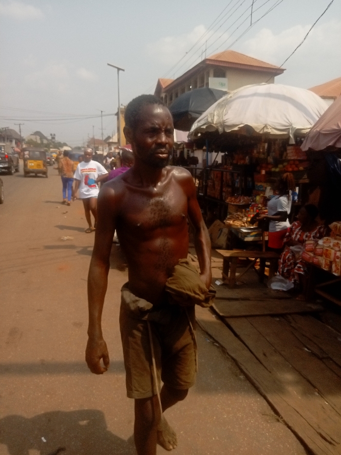 A barefoot, shirtless man walks along a street lined with vendor stalls and pedestrians. He is dark-skinned, sweaty, and appears thin, with a cloth tied around his waist and another clutched in his hand. The backdrop shows a bustling outdoor market under a partly cloudy sky, with various stalls selling goods under umbrellas and canopies. A yellow taxi-like vehicle can be seen further down the street among other cars.