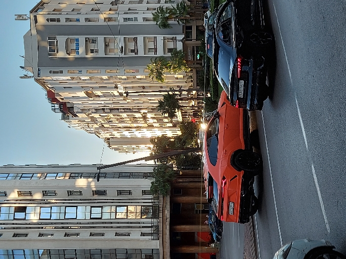 The image presents an urban street scene in Tangier, Morocco, illuminated by direct sunlight, casting reflections and moderate shadows, suggesting either late morning or early afternoon. The scene is dominated by multiple vehicles and modern multi-story buildings. In the mid-ground, a vibrant orange Lamborghini Urus SUV with black wheels and tinted windows is positioned in the left lane of an asphalt road, facing away from the camera. Its rear Moroccan license plate reads "أ ٤٣٦٢٥ / ٨". To its immediate right, in an adjacent lane, a black Audi sedan, also with black wheels and tinted windows, is similarly oriented away from the camera. This vehicle displays a Moroccan license plate reading "٤٣٣٢ ب / ١". A partial view of a light-colored vehicle occupies the bottom left corner of the frame. Further down the road, additional vehicles are visible, including a dark blue car parked adjacent to a building on the left. The left side of the image is occupied by a tall, cylindrical or curvilinear modern building, predominantly light-colored, featuring numerous reflective, rectangular windows arranged vertically. Its lower section presents a darker, recessed base with visible columns. On the right, a row of multi-story buildings lines the street. The most prominent building on this side is light grey with white architectural details, multiple balconies (some with blue-tinted glass railings), and a flat roof equipped with communication antennas. Palm trees are interspersed along the streetscape. A dark, vertical street light pole is centrally located between the main buildings. Overhead wires traverse the frame. The road itself is asphalt with clear white lane markings. No individuals are distinctly visible in the immediate foreground or mid-ground.