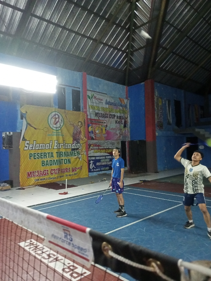 Two badminton players are on a blue court, one serving a shuttlecock. The court is indoors under a metal roof. Banners hang on the walls, advertising the "Mujagi Cup 2021" badminton tournament. A net divides the court, displaying the "Reinforce Speed" logo. The players are in athletic wear, shorts and t-shirts.