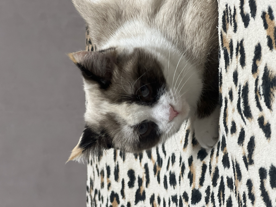 - "A colorpoint cat with cream and white fur, featuring distinct dark brown markings on its ears and a mask-like area around its blue eyes, is depicted lying on a leopard-print blanket" by FM-A5lOj2, licensed under CC BY 4.0