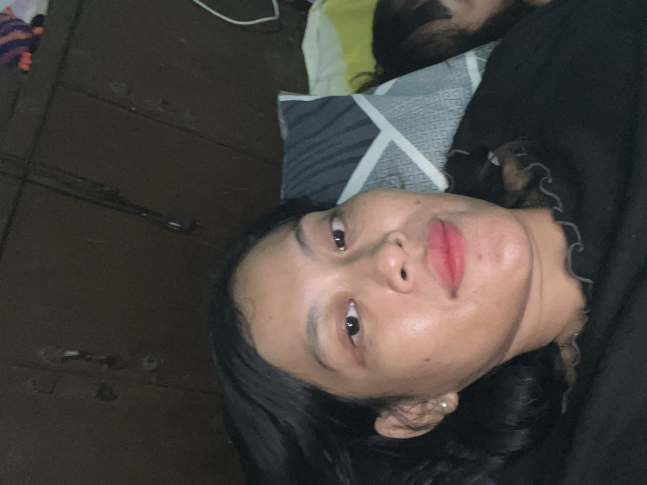 In an indoor setting within Kecamatan Pati, Indonesia, a medium-shot captures two individuals, primarily focusing on an adult female in the foreground. The female, with dark hair, a medium complexion, and visible red lipstick, wears a black garment with a ruffled neckline and a small stud earring in her left ear. She is positioned reclining, looking directly towards the camera with a neutral expression. To her right, a second individual's head, showing dark hair, is partially visible, suggesting they are also reclining. A dark grey pillow with a light geometric pattern supports the female and is partially beneath the second individual. The background reveals a dark brown, possibly wood-paneled or painted wall, exhibiting various scuff marks, dark linear elements resembling cables or structural lines, and circular indentations. A white cable is indistinctly visible in the upper right quadrant of the background. The lighting is dim, indicating an indoor environment, possibly a bedroom or resting area.
