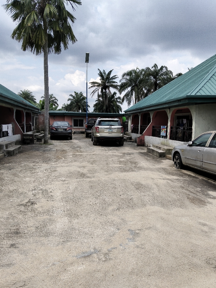 This image depicts an outdoor parking or courtyard area within a residential or commercial compound in Port-Harcourt, Rivers State, Nigeria