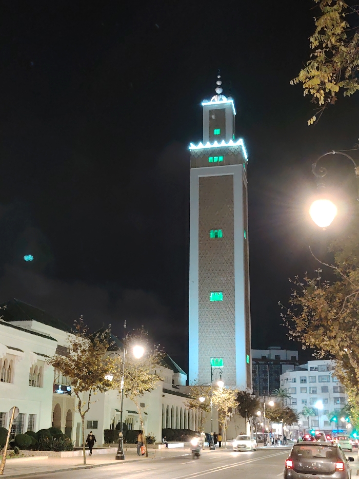 - "The image depicts a nighttime street scene in Tangier, Morocco, featuring the illuminated minaret of the Mohammed V Mosque" by FM-10g0q2, licensed under CC BY 4.0