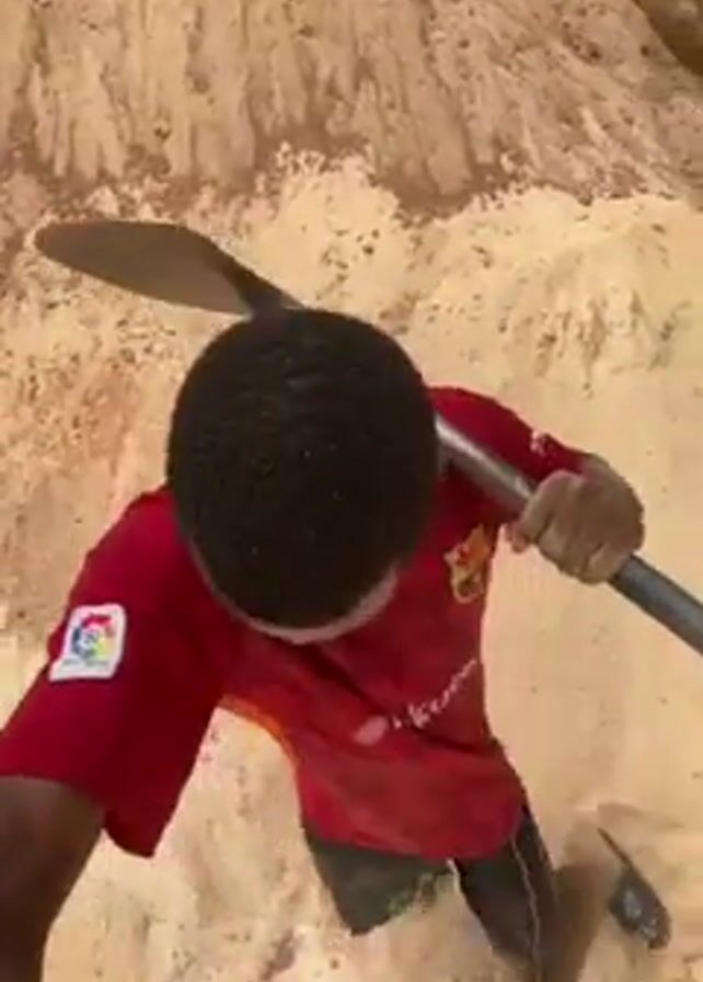 A man stands in a sandy area with a shovel over his shoulder. He's wearing a red soccer jersey. He is looking into the camera and talking. Behind him are tall, sandy hills.