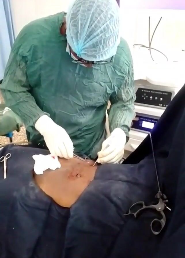 A surgeon is performing a laparoscopic surgery