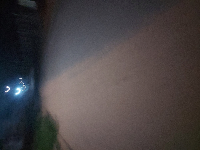The image presents a nighttime street scene in Onitsha, Nigeria. A dark grey, textured surface, consistent with a paved or unpaved road or pathway, dominates the foreground and extends into the upper-middle distance. To the immediate left of this pathway, a faint, darker green area suggests the presence of vegetation. The surrounding environment is largely obscured by darkness, with indistinct shapes possibly indicating distant structures on the right side. In the upper-middle portion of the frame, several prominent, blurred light sources appear as distinct, elongated white and light blue 'U'-shaped streaks, indicative of artificial illumination such as streetlights, captured with motion blur. No individuals, vehicles, or specific objects are identifiable within the scene. The overall conditions are characterized by low light and limited visibility.