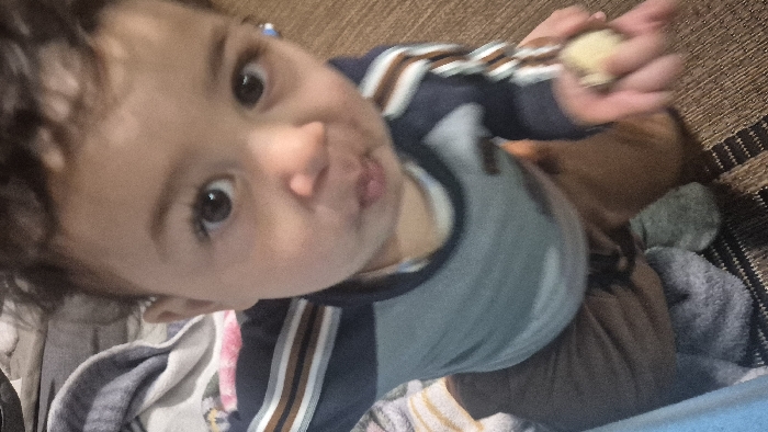 An image depicts a young child, appearing to be a baby or toddler, with dark, curly hair and dark eyes