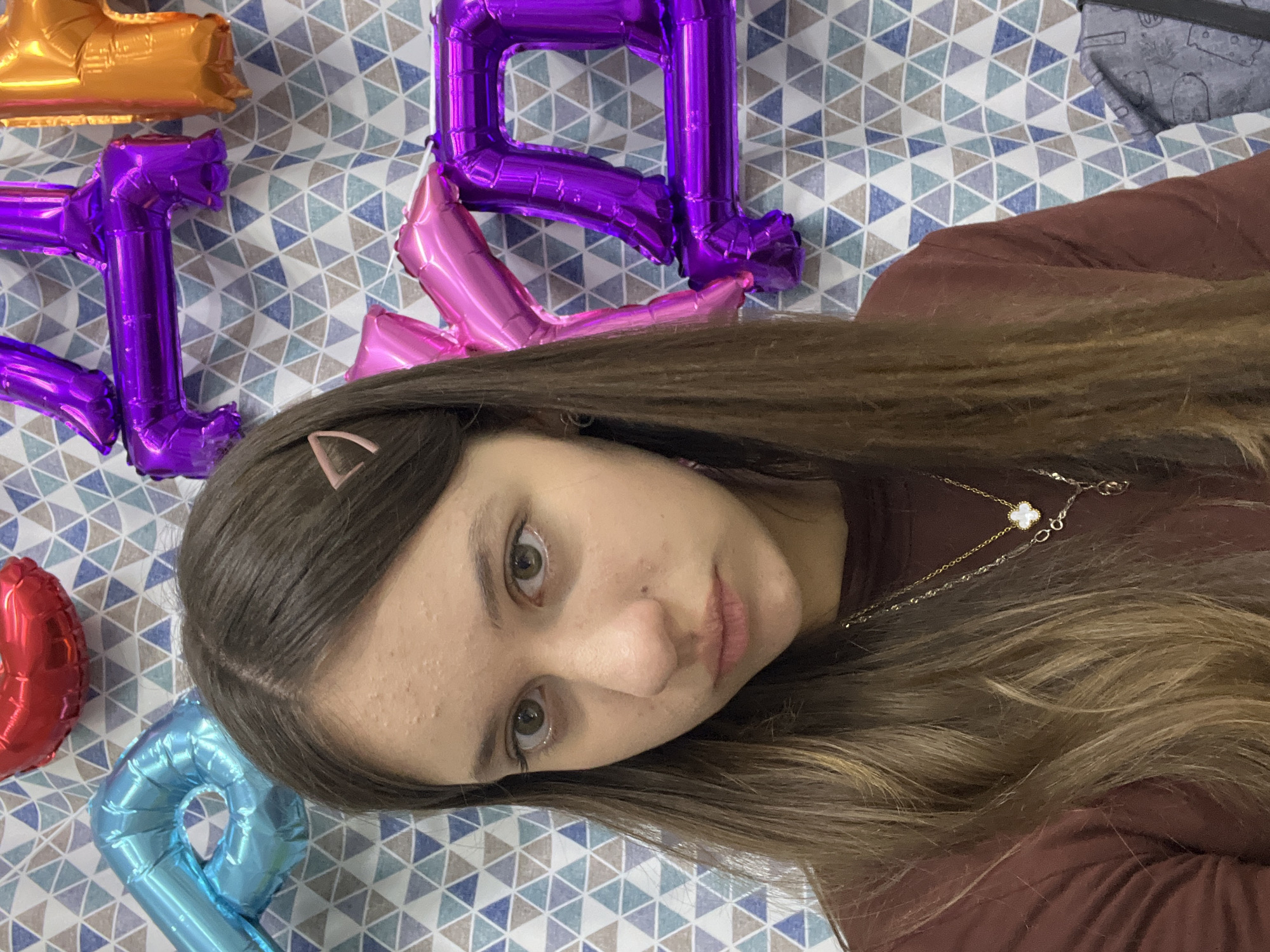 The image displays a young female, situated in what is identified as the city of Ketoshi, Russia, captured in a head-and-shoulders shot. Her long, light brown hair is parted centrally and falls over her shoulders. She looks directly forward with a neutral expression; her eyes are light brown. Minor skin texture and blemishes are visible on her forehead and nose. She is wearing a dark reddish-brown high-necked garment. Two layered necklaces adorn her neck: one is gold-toned with a white four-leaf clover-like pendant, and the other is silver-toned with a smaller, irregular pendant. A light pink triangular hair clip is present on the right side of her head (viewer's left). The background consists of a fabric or wallpaper with a repeating geometric pattern of blue, grey, white, and brown triangles. Attached to this background are multiple foil letter balloons in various colors, including a light blue letter "Р", a purple letter "Д", and partial views of red, pink, and orange balloons.