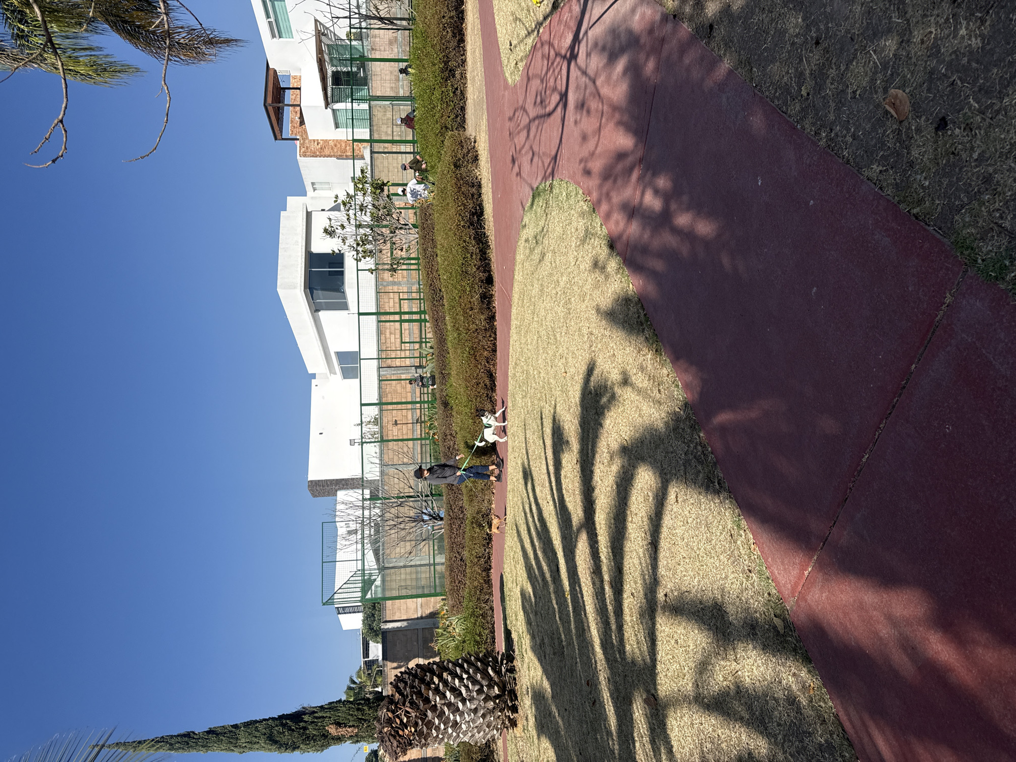 The image depicts an outdoor scene in San Bernardino Tlaxcalancingo, Mexico, under a clear blue sky. A red concrete walkway curves diagonally across the frame, bordered by patches of dry grass and a trimmed hedge. White modern buildings with green fencing are visible in the background. A person wearing a dark jacket and jeans is walking along the hedge with two dogs on leashes. Shadows from palm trees fall across the grass and walkway. A large palm tree trunk base is visible in the lower left corner. Other people are also seen standing near the building in the background.