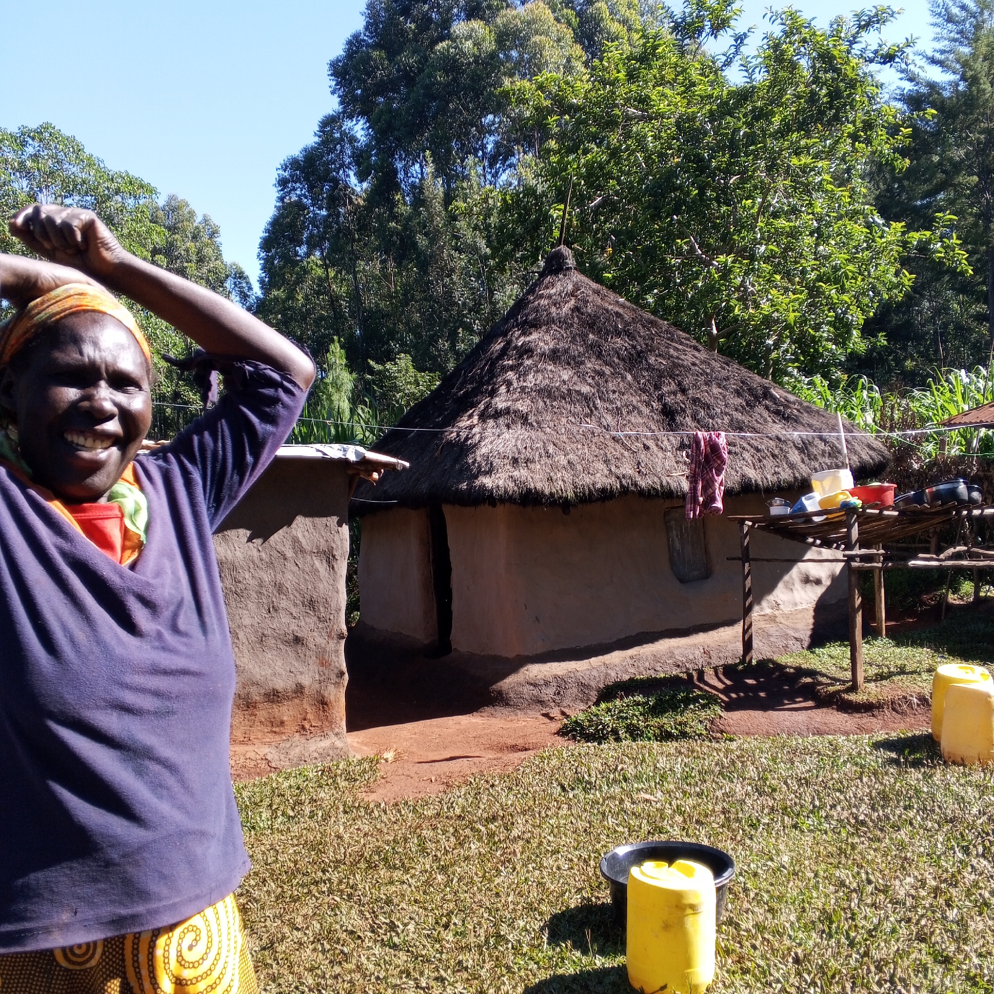 The photograph depicts a woman smiling with her arms raised in Getenga ward, Kenya. She is wearing a dark blue long-sleeved shirt, a yellow and brown patterned skirt, and an orange headscarf. Behind her is a small, earthen house with a thatched roof. A clothesline is strung near the house, with a red and white garment hanging on it. Next to the house, there is a wooden structure holding dishes and pots. The foreground shows a grassy area with two yellow jerrycans near a black bucket. Trees are visible in the background. The overall scene suggests a rural setting.