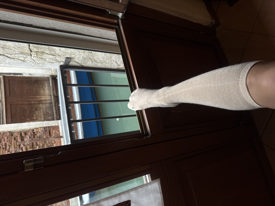 A human leg, clad in a light beige ribbed knee-high sock, extends horizontally across the lower center of the frame, with the foot flexed upwards