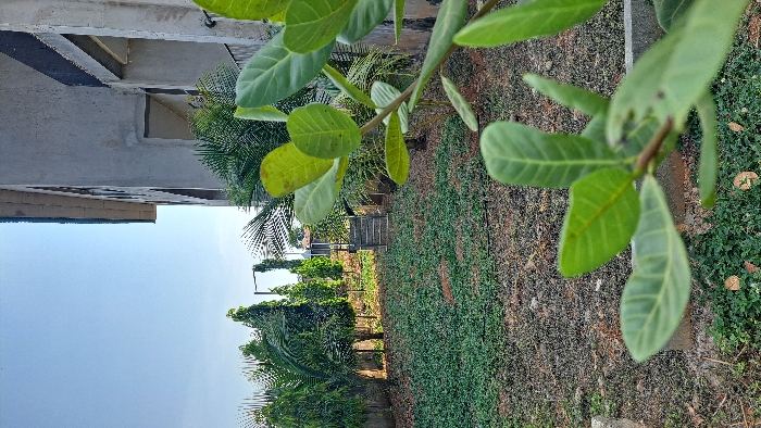 The image displays an outdoor scene in Donga, Nigeria, under a clear blue sky. A leafy green plant branch occupies the lower right foreground, partially out of focus. The midground consists of a patchy lawn with sparse green ground cover mixed with dry earth and brown detritus. In the center-background, a concrete staircase ascends slightly. Behind the steps, a tall, slender dark pole is visible. To the left and behind the steps, a line of trees includes tall, conical evergreens and broader-leafed palm trees. The right side of the frame features a multi-story, unfinished concrete building with several open window or balcony structures. No individuals or active events are present.
