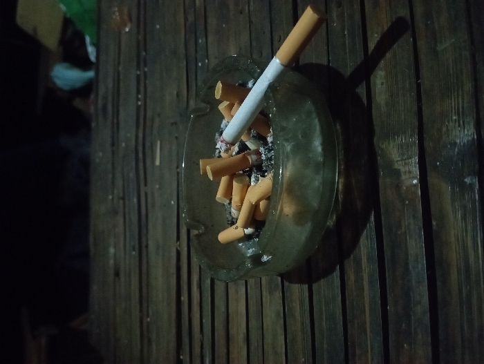 - "glass ashtray containing multiple cigarette butts and a cigarette" by FM-3hh522, licensed under CC BY 4.0