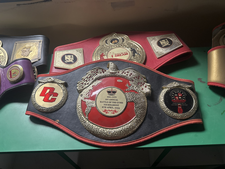 This image presents a close-up view of multiple championship-style belts displayed on a green surface, likely a shelf or table, in Gainesville, United States of America