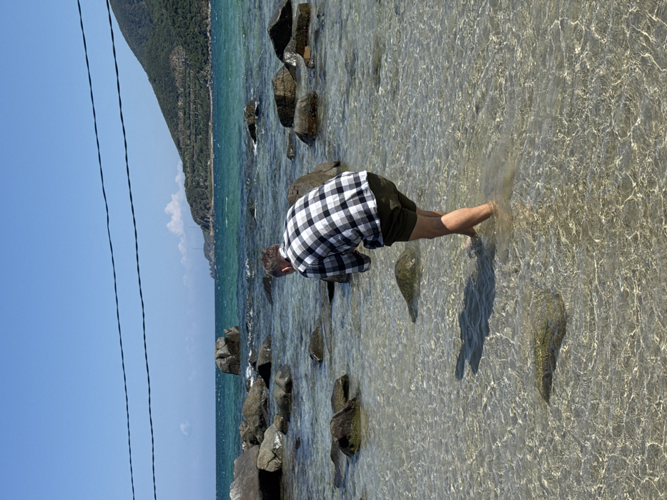 - "An adult male is observed from a rear perspective, standing barefoot in clear, shallow ocean water at a rocky shoreline in Vĩnh Lương, Vietnam" by FM-Oi8nu1, licensed under CC BY 4.0