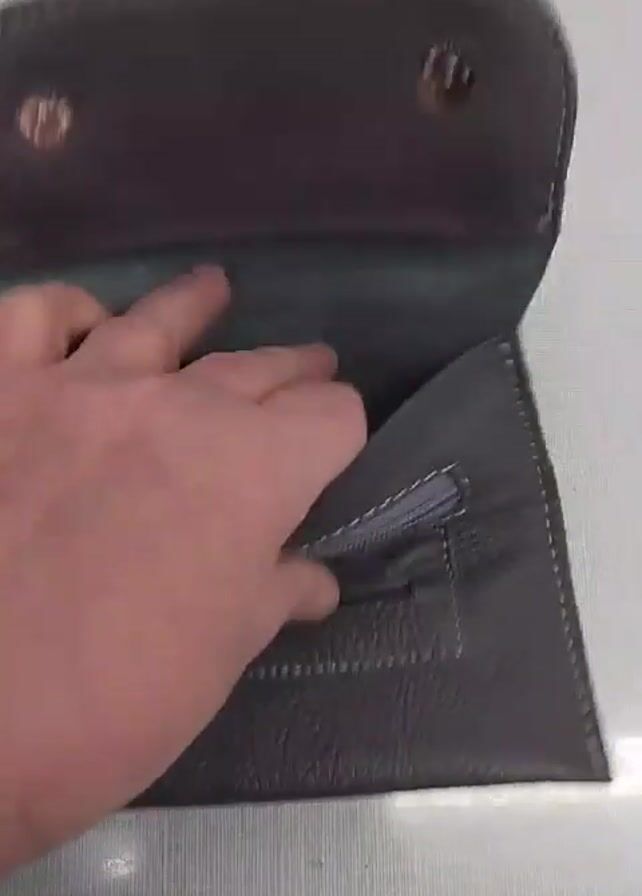 A hand opens a gray leather wallet on a white surface. The wallet has a flap with two snap closures, a small zippered pocket, and a holder. The flap of the wallet has a small tag that says "hand made".