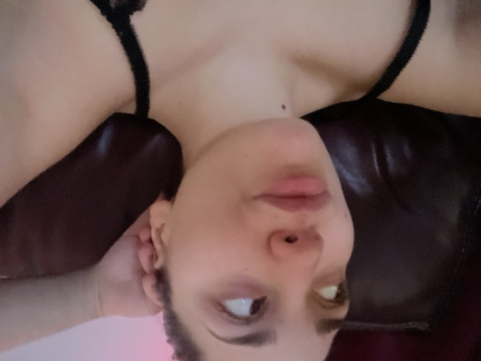 A person reclines on a dark brown leather surface wearing a black lacy top with thin straps. Their head is tilted with fair skin, full lips, and dark eyebrows. One eye is visible, gazing upwards. Their hand rests near their ear. The image is rotated, giving a disoriented, angled perspective.