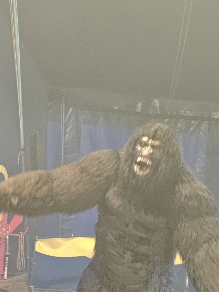 A menacing, oversized, black gorilla costume dominates the frame, snarling with bared teeth and a fierce expression. The fur appears dense and shaggy, contrasting with the pale flesh around its mouth and eyes. The background features a simple blue and white draped backdrop, likely a stage or tent setting. To the left, indistinct circus equipment, including ropes and poles, adds to the scene's context, hinting at a performance or exhibit.