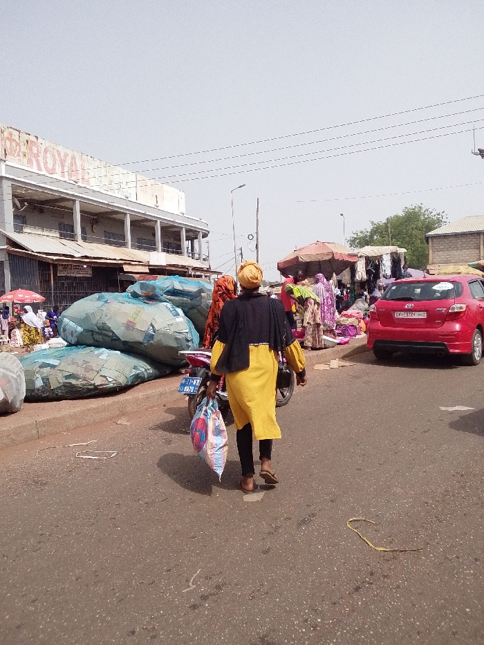 The image depicts a bustling street scene in the city of Tamale, Ghana, specifically near a multi-story building prominently displaying "ROYAL" in large red letters on its facade, suggesting a commercial district or market area. In the foreground, a person, identifiable by attire as female, walks away from the viewer towards the right side of the frame. She wears a long yellow tunic over black leggings, a black short-sleeved top, and a yellow head wrap, with brown sandals on her feet. She carries a multicolored shopping bag in her left hand. The asphalt road surface is visible, showing signs of wear and scattered light-colored debris. To the left of the walking person, large, irregularly shaped bundles, appearing to contain compressed materials like cardboard or paper, are stacked along the curb. These bundles are encased in a light blue mesh netting. A red motorcycle, partially obscured by the walking figure, displays a blue license plate reading "M-21-NT 8870." The midground features an active open-air market with numerous individuals, consistent with vendors and shoppers. People are dressed in various garments, including head wraps and long dresses. Market stalls, some shaded by tarpaulins or umbrellas (one prominent reddish-brown umbrella is visible), display goods on the ground and on tables. A red hatchback vehicle, bearing the license plate "GW-3724-10," is parked on the right side of the street, facing away from the viewer. The background on the left reveals a light grey, two-story building with white railings, where the "ROYAL" sign is affixed. The horizon is marked by indistinct buildings, some sparse green foliage, and utility poles with overhead power lines. The sky is clear and bright, indicating daylight hours.