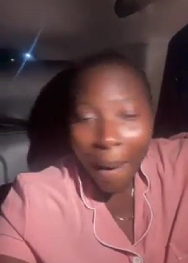 A woman is sitting in a car, wearing a pink, short-sleeved pajama top with white piping, a gold necklace, and small earrings. She is looking at the camera and talking, with a slight smile. Her hair is braided back from her face. The interior of the car is dark, and the light is coming from in front of her. There is a headrest behind her. Music is playing.
