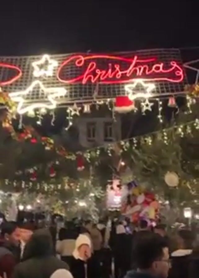 crowded outdoor Christmas celebration at night. A large, red, neon "Christmas" sign hangs above the crowd. Decorations, including stars, bells, and Santa hats, are strung across the street. There are trees with white lights. A vendor sells balloons in the center of the crowd. The crowd is diverse in age and attire. People are standing and walking around, seemingly enjoying the festive atmosphere. The background shows buildings.
