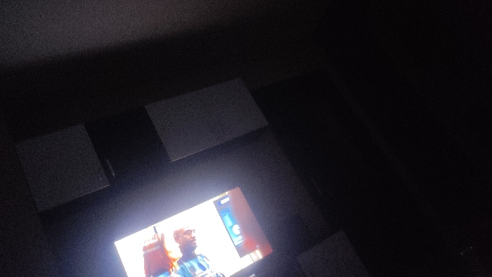The image displays an indoor scene within a dimly lit room in Hadzhidimitrovo, Bulgaria. A brightly illuminated television screen is positioned diagonally in the lower-middle section of the frame. The screen exhibits visual content featuring a bald individual with dark skin, wearing a blue and black patterned shirt, visible from the chest up on the left side. To the right of this individual, a graphical interface with a blue background and white circular icons is displayed. Surrounding the television are several rectangular objects: two light gray rectangles are mounted above the screen, a darker gray rectangular object is located to the screen's left, and a partially visible dark rectangular object is present in the lower right portion of the image, presumably part of an entertainment system. The room's ceiling or upper wall, visible in the top left, is dark and exhibits a fine texture. The overall environment is characterized by minimal ambient light.