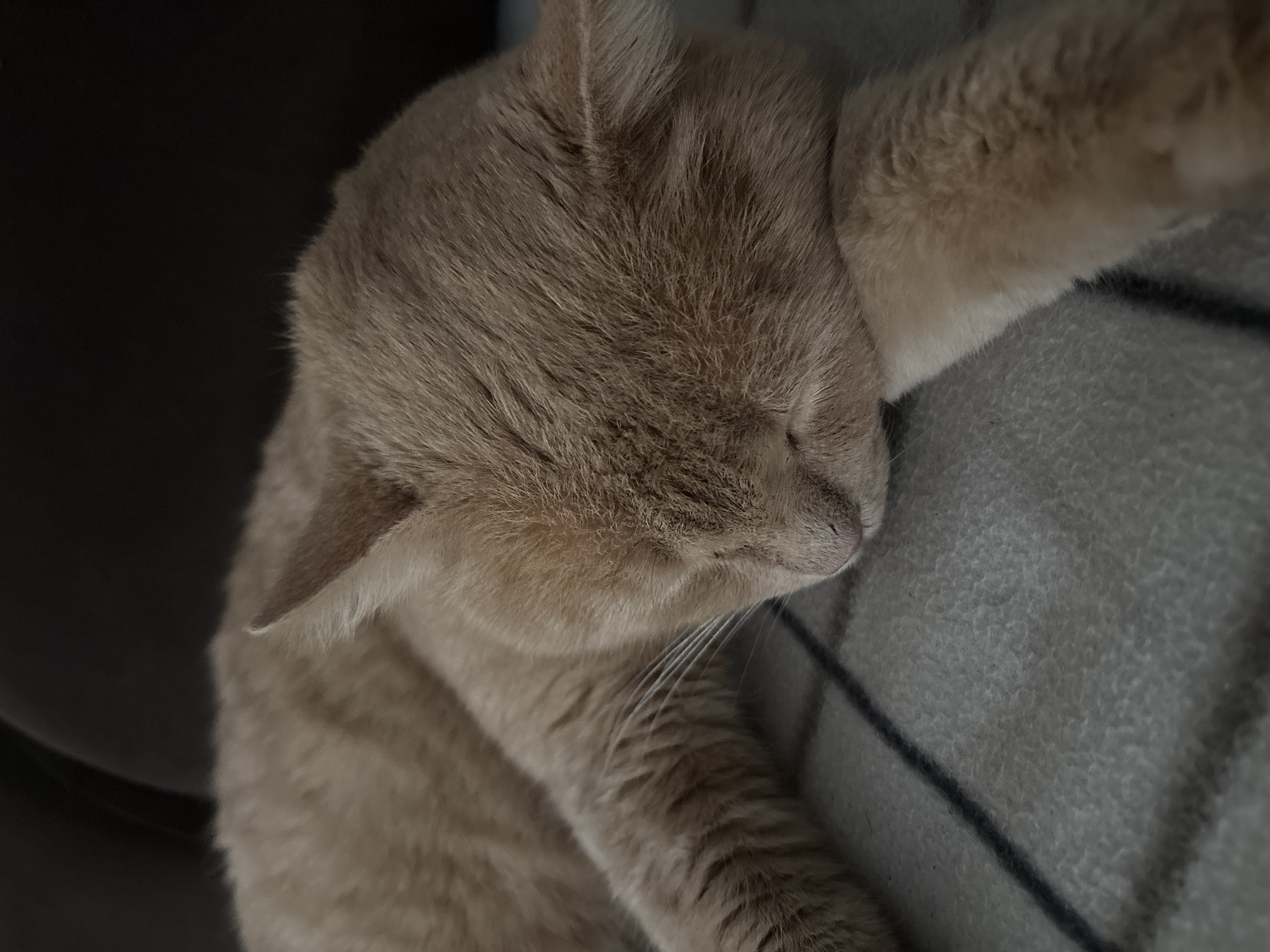 - "A light tan cat is sleeping on a light gray blanket with dark gray stripes" by FM-PD7Ls2, licensed under CC BY 4.0