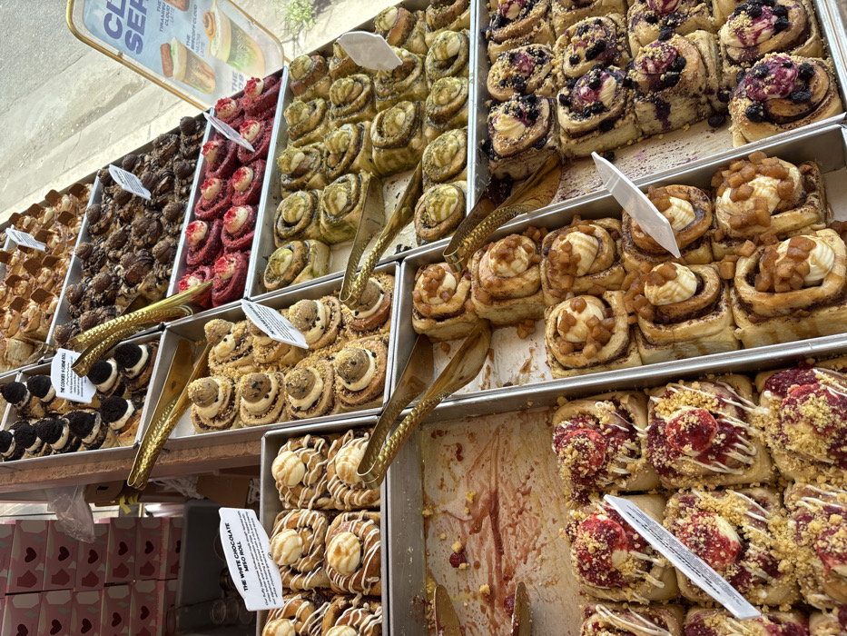 - "A tempting display of various flavored cinnamon rolls arranged in metal trays" by FM-kVMXo2, licensed under CC BY 4.0