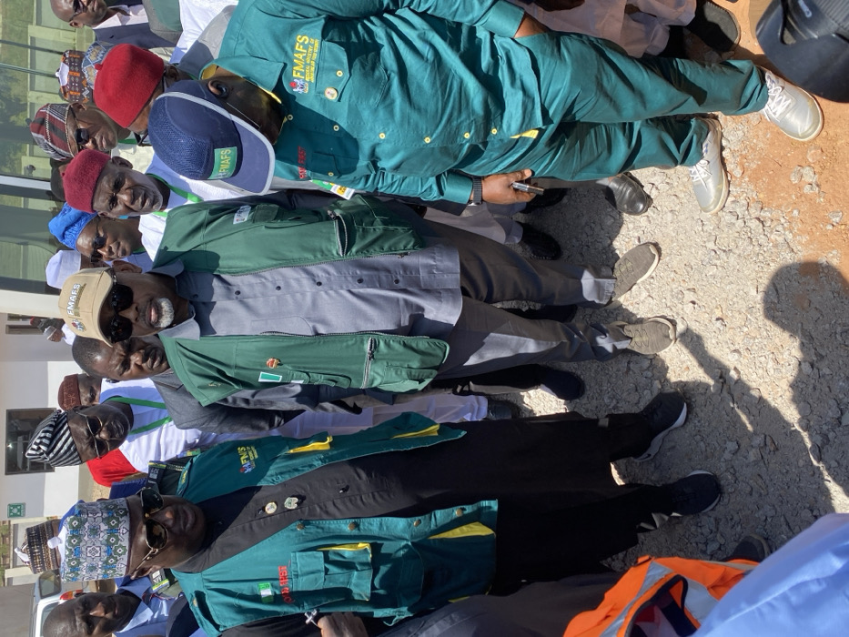 This image captures an outdoor gathering of approximately 15-20 men in Gwagwada, Nigeria, under bright daylight conditions. The ground consists of light gravel and reddish-brown soil, with distinct shadows indicating direct overhead sun. In the background, a white building with a partial green roof section and a white vehicle are visible. Three men are prominent in the foreground. On the left, a man wears a patterned, multi-colored cap, dark sunglasses, a black traditional tunic, and a green vest with yellow trim and multiple pockets. His vest bears a visible "FMAFS" logo, identifiable as the Federal Ministry of Agriculture and Food Security, and a small Nigerian flag patch. He wears black sneakers. The central man wears a light brown baseball cap with "FMAFS" text, dark sunglasses, a grey collared shirt, grey trousers, and a dark green vest, also with multiple pockets and a small Nigerian flag patch. He wears khaki-colored sneakers. The man on the right, with his head bowed downwards, wears a dark blue baseball cap with "FMAFS" text. He is dressed in a teal/dark green uniform, comprising a long-sleeved shirt with the "FMAFS" logo and matching trousers. His feet are clad in light-colored sneakers. His right hand holds a small dark object. Other attendees in the background are partially visible, wearing a mix of traditional attire, including various caps (white, red, blue, striped), and some in semi-formal Western clothing. No direct interactions or specific actions beyond standing and observing are discernable among the crowd.