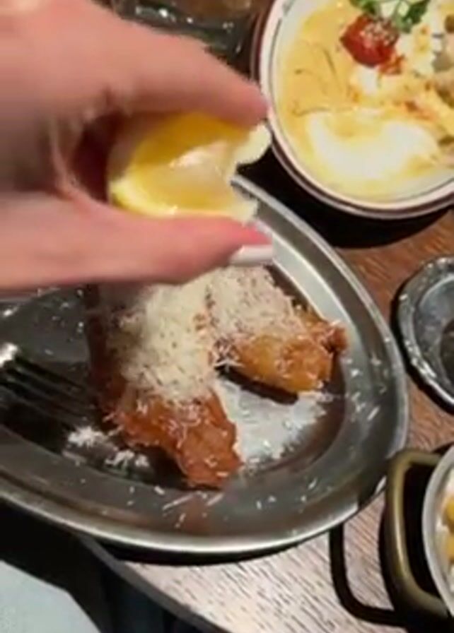 Here's a detailed description of the video: A hand with white nail polish is squeezing a lemon wedge over a plate of fried food covered in grated cheese