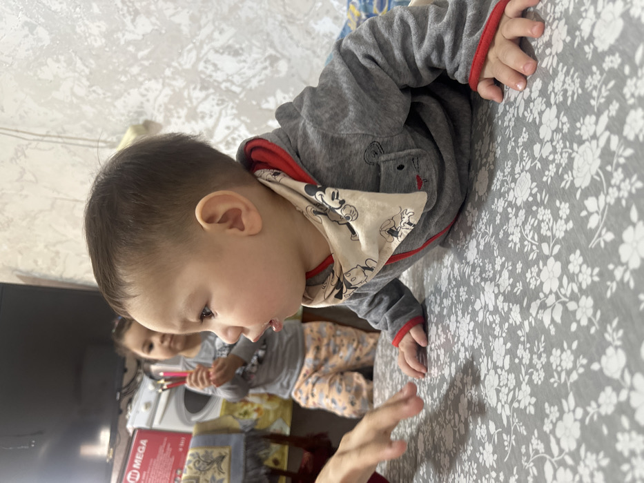 A toddler in a gray and red hooded jacket with a Mickey Mouse bib crawls on a gray floral-patterned surface. Another child with patterned pajamas sits in the background, holding colorful objects. A washing machine, a TV, and a box labeled "MEGA" are visible behind the second child. An adult's hand reaches towards the crawling toddler.