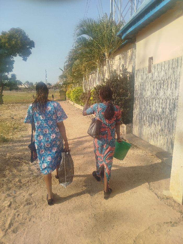 Two adult females are depicted walking away from the camera on an unpaved, reddish-brown dirt path under a clear, light blue sky. The subject on the left wears a blue and white floral patterned short-sleeved dress, carries a dark shoulder bag on her left shoulder, and a large dark bag in her right hand. Her hair is styled in dark braids. The subject on the right wears an orange, blue, and white geometric patterned ankle-length dress with a rear slit, carries a dark brown shoulder bag on her left shoulder, and a green plastic bucket in her left hand. Her right arm is slightly raised, and her dark hair is pulled back in braids. To the right of the path, a building features a light-colored upper wall and a lower section clad with vertical dark grey, textured rectangular tiles. A blue fascia is visible beneath the roofline. A dense line of green vegetation, including several palm trees, runs along the building's wall. To the left of the path, an open field with sparse, dry vegetation extends into the distance, where faint structures and a communication tower are visible. Shadows are cast on the path, indicating strong sunlight. The scene is located in the city of Ube, Nigeria.